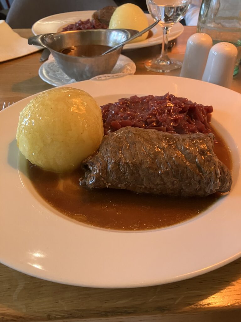 さらに伝統的な料理としては、薄い牛肉でピクルスやベーコンを巻いて煮込む「ルーラーデン」がある。ボリュームは程よく、日本人でも食べやすい。