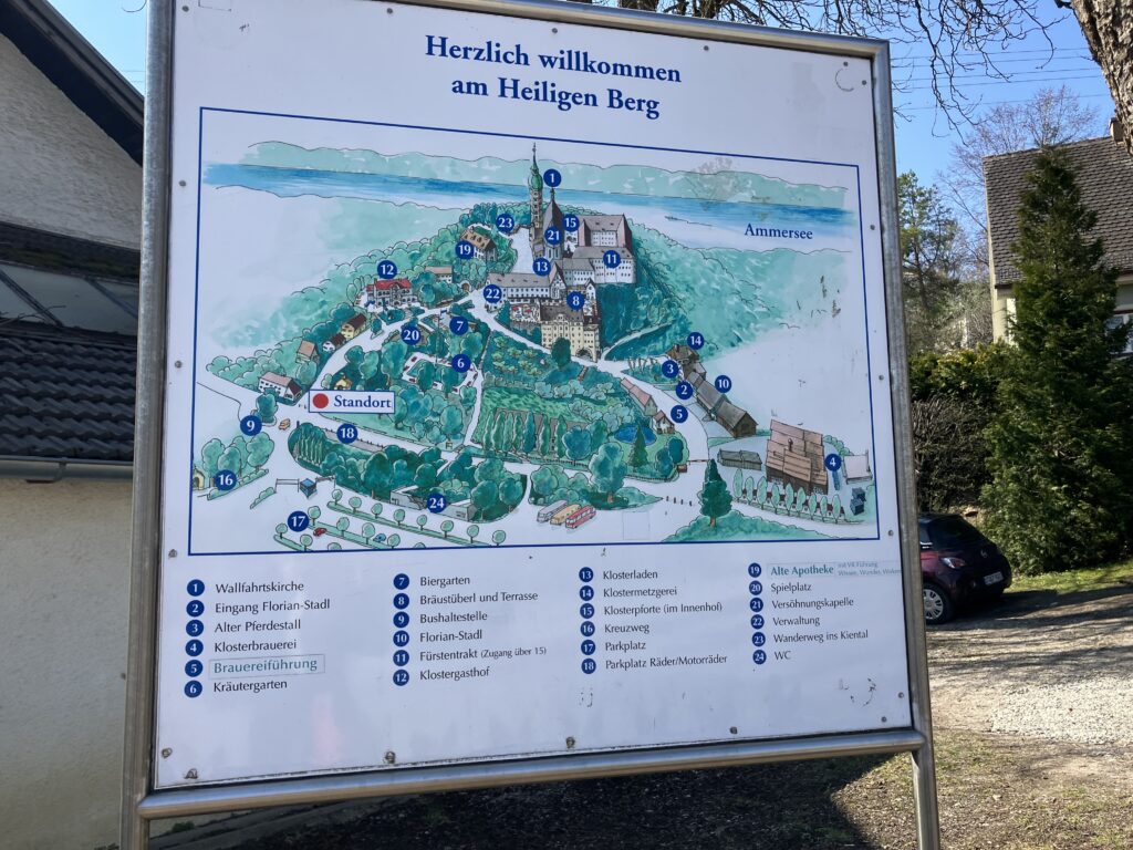 さて、アンデックス修道院の敷地内を散策してみよう。地図を見ると、礼拝所、ビール醸造所、ビアガーデン、薬局、精肉所、薬草園などがある。まずは礼拝所に向かう。