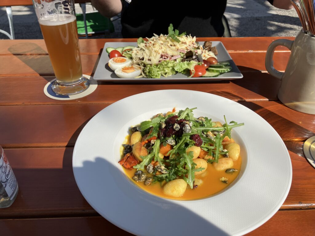 典型的なドイツ料理と少しモダンな料理のフュージョンといった感じだ。夫は醸造長のサラダ(Braumeistersalat)、私はニョッキを注文。夫のサラダには、敷地内で作られたスモークハムやチーズがトッピングとして乗っかっている。普段はハムやチーズはほとんど食べない私だが、一口味見させてもらったら、とても美味しかった。真空パックされて販売されているのでお土産にも最適だ。