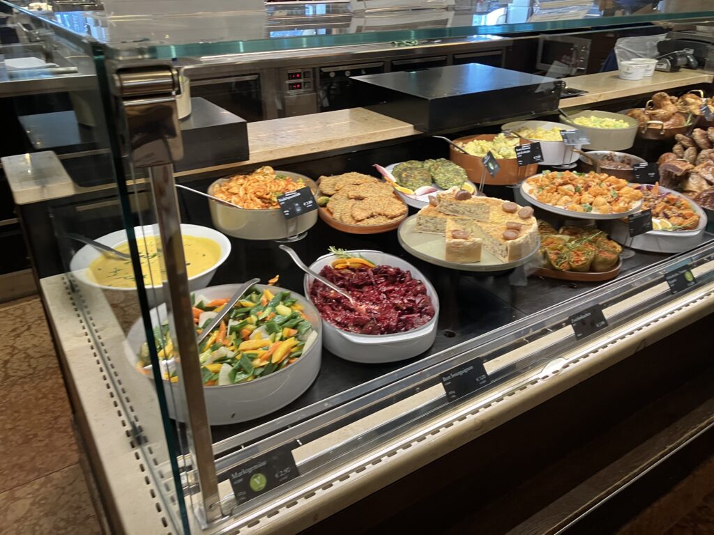 入口から入って右手は生鮮食品、総菜売り場になっている。魚、チーズのほか、出来合いのお惣菜、高級食材が所狭しと並んでいる。私のお気に入りは、お総菜売り場のVittelo Tonato。家でイタリア料理を作るときに前菜の一つとして時々購入している。その他、サラダやドイツ料理のクヌーデル、パスタ・ラビオリなども販売されている。量り売りのサラダはかなり割高で、値段の割に味は意外と普通。特にここでなければ食べられない、という味ではなかったので、ご参考までに。