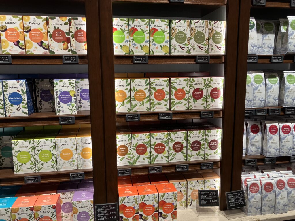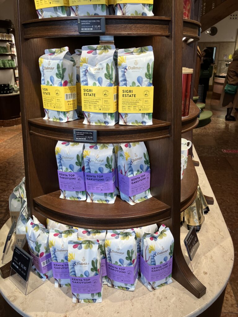 ダルマイヤーと言えばコーヒーも有名だ。REWEなどの通常のスーパーでも、ダルマイヤーのProdomoシリーズが販売されている。ミュンヘンの本店では、他にもスペシャルティコーヒーが販売されており、酸味や苦みなど自分の好みに合わせたコーヒー豆を購入することができる。