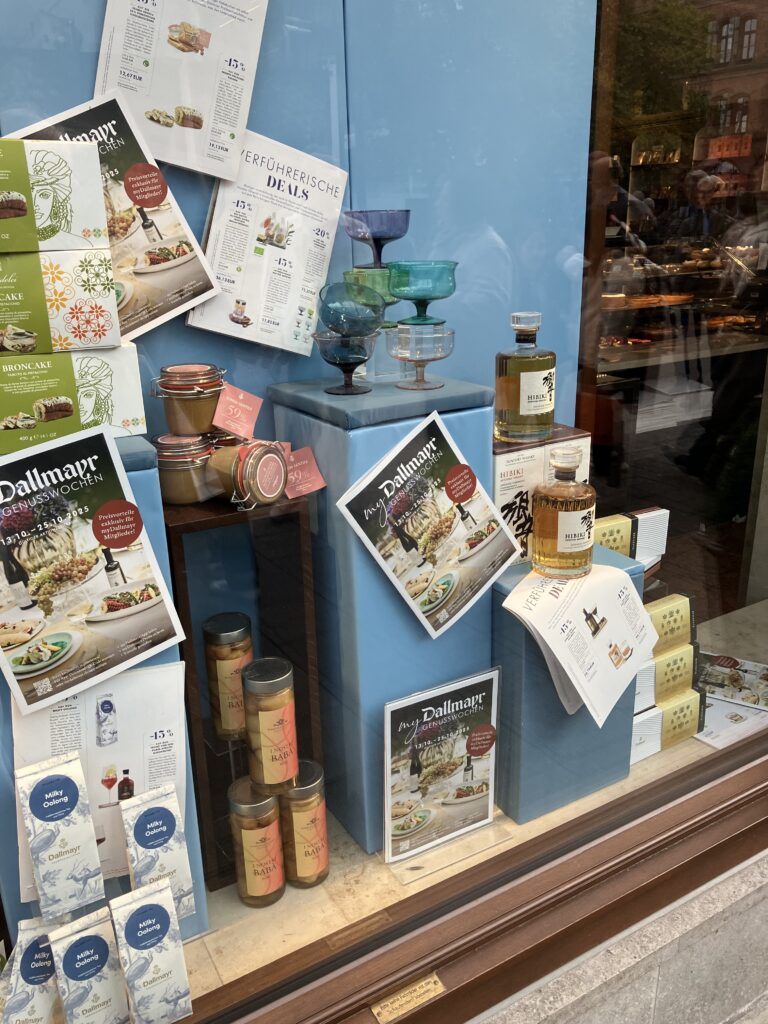 外のショーウィンドーには、コーヒーやチーズといった商品が綺麗に並べられており、高級食材店の雰囲気を醸し出している。