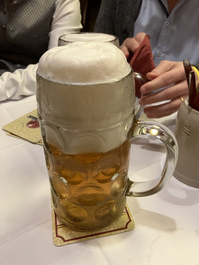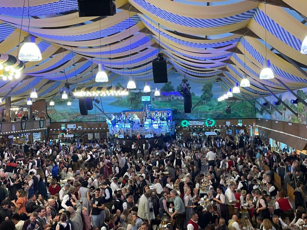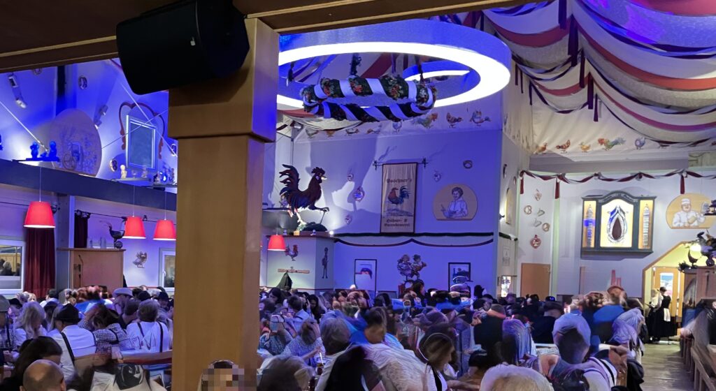 アウグスティーナー、レーベンブロイ、ホフブロイといった大手ビアホールのテントに比べて規模は小さく、収容人数は100〜200人程度。騒がしさも控えめで、ウェイターの対応も丁寧。落ち着いて楽しめる雰囲気であった。